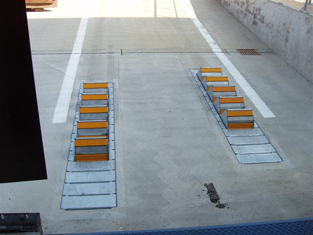 - Le système est composé d’une grande cale d’acier montée au bout d’un bras à contrepoids. La cale, disposée devant la roue arrière du véhicule, s’agrippe à une plaque au sol en acier galvanisé.